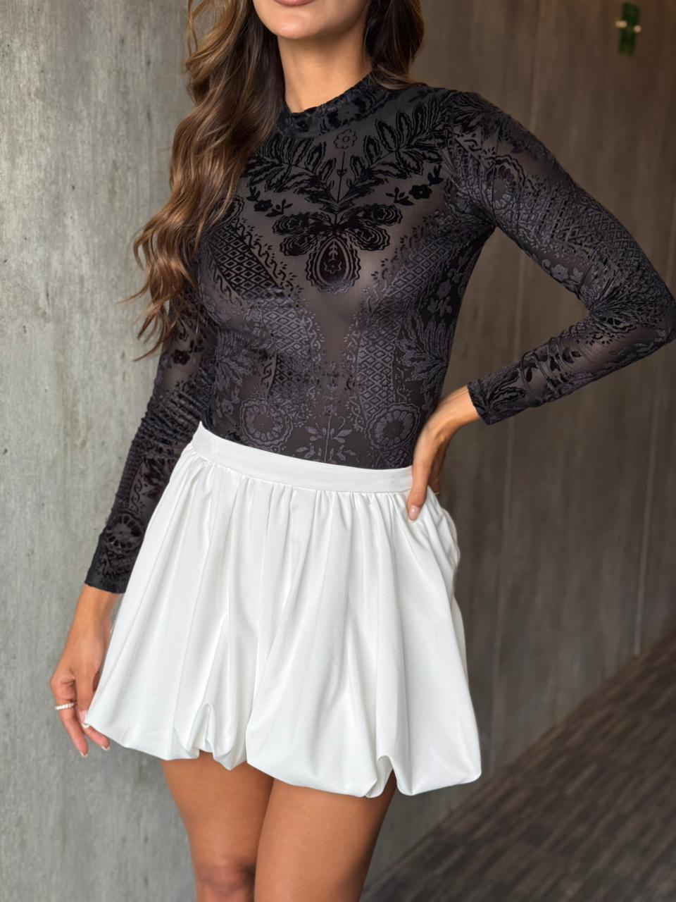 Elegante body negro con arabescos que combina sofisticación y comodidad. Confeccionado en tela de alta calidad.