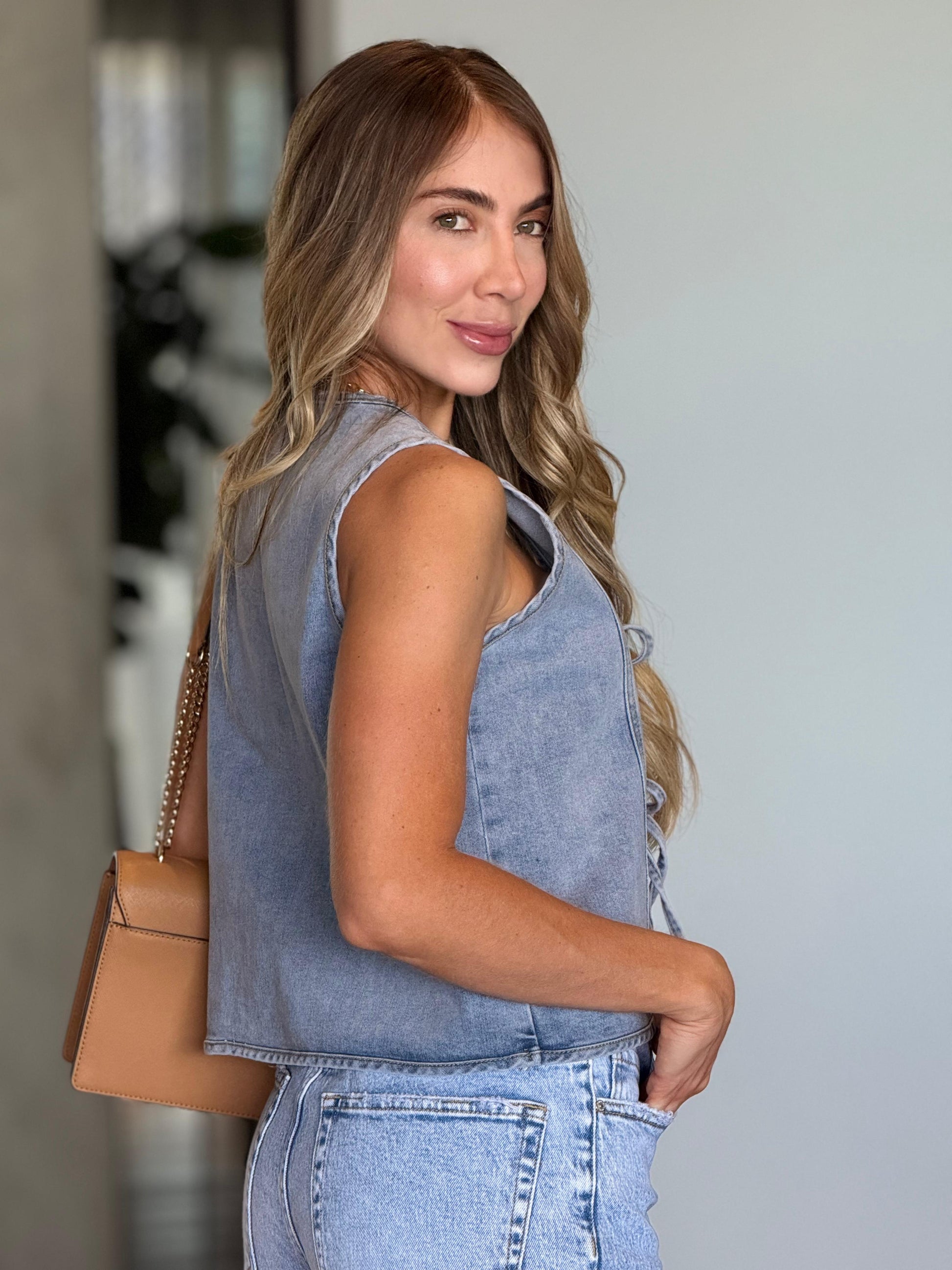 Este chaleco de jean con lazos para amarrar combina estilo y funcionalidad, ofreciendo un ajuste personalizado que realza cualquier conjunto. Su diseño clásico en denim garantiza durabilidad y versatilidad, ideal para capas adicionales en cualquier temporada. Perfecto para quienes buscan una prenda que aporte carácter y comodidad a su guardarropa.